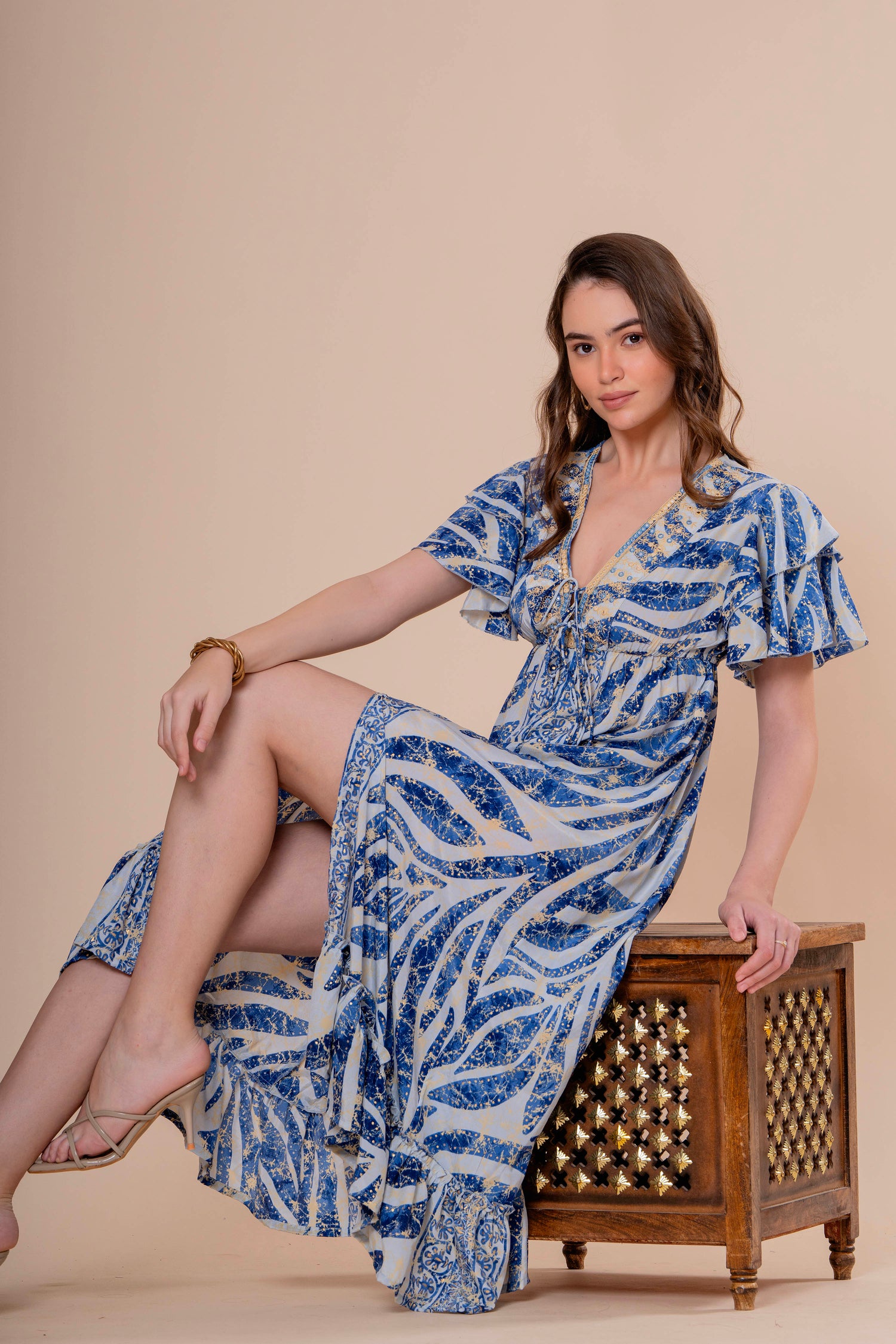 Un diseño pensado para acompañarte en tus mejores recuerdos. Su caída suave y sus mangas con vuelo aportan ese toque romántico y sofisticado que buscas para tus tardes de verano.