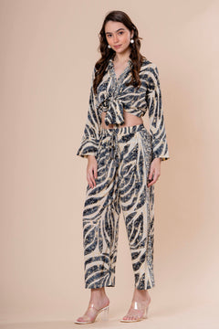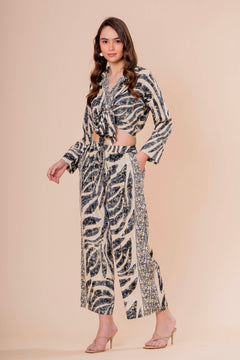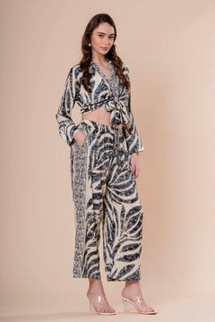 Un elegante conjunto de dos piezas perfecto para un look casual o resort. Incluye un top cropped camisero de manga larga con nudo frontal y un pantalón recto de cintura fluida. El estampado abstracto en tonos neutros le da un aire sofisticado.