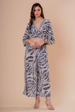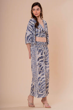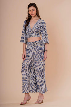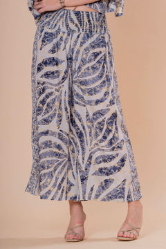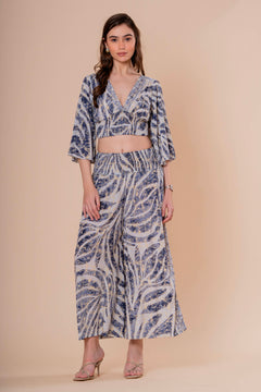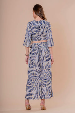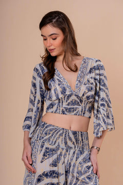 Impresionante conjunto de dos piezas ideal para resort o eventos de verano. El top cropped presenta un elegante escote en V y mangas campana 3/4. El pantalón de talle alto ofrece una caída fluida con una cómoda cintura fruncida (smocked) que define la figura.