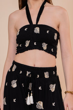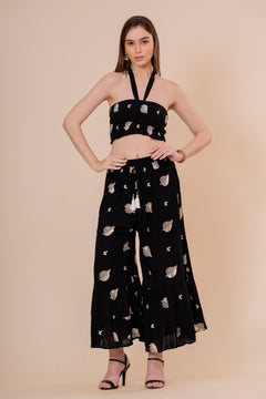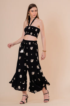 Un elegante set de dos piezas compuesto por un top bandeau fruncido y una falda maxi a juego. El fondo negro resalta un delicado estampado de hojas doradas. La cintura elástica de la falda con borlas y el top ajustado crean una silueta sofisticada y cómoda, perfecta para eventos de noche o looks de resort.