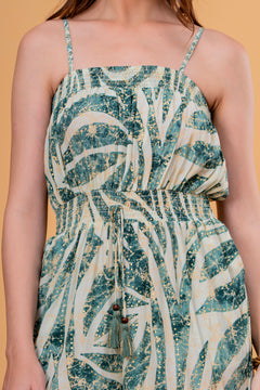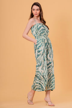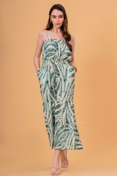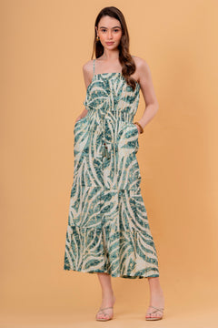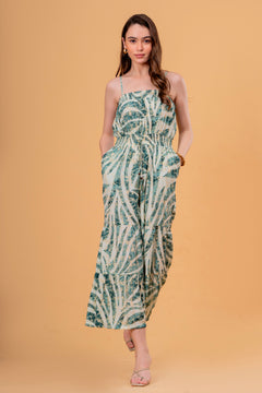 Un mono largo cómodo y con estilo que simplifica el vestuario. El top de corte strapless (sin hombros) cuenta con un favorecedor fruncido elástico (smocked) en el pecho. La pernera ancha y fluida, junto con el estampado botánico en tonos menta, lo hacen ideal para viajes y verano. Incluye bolsillos prácticos.