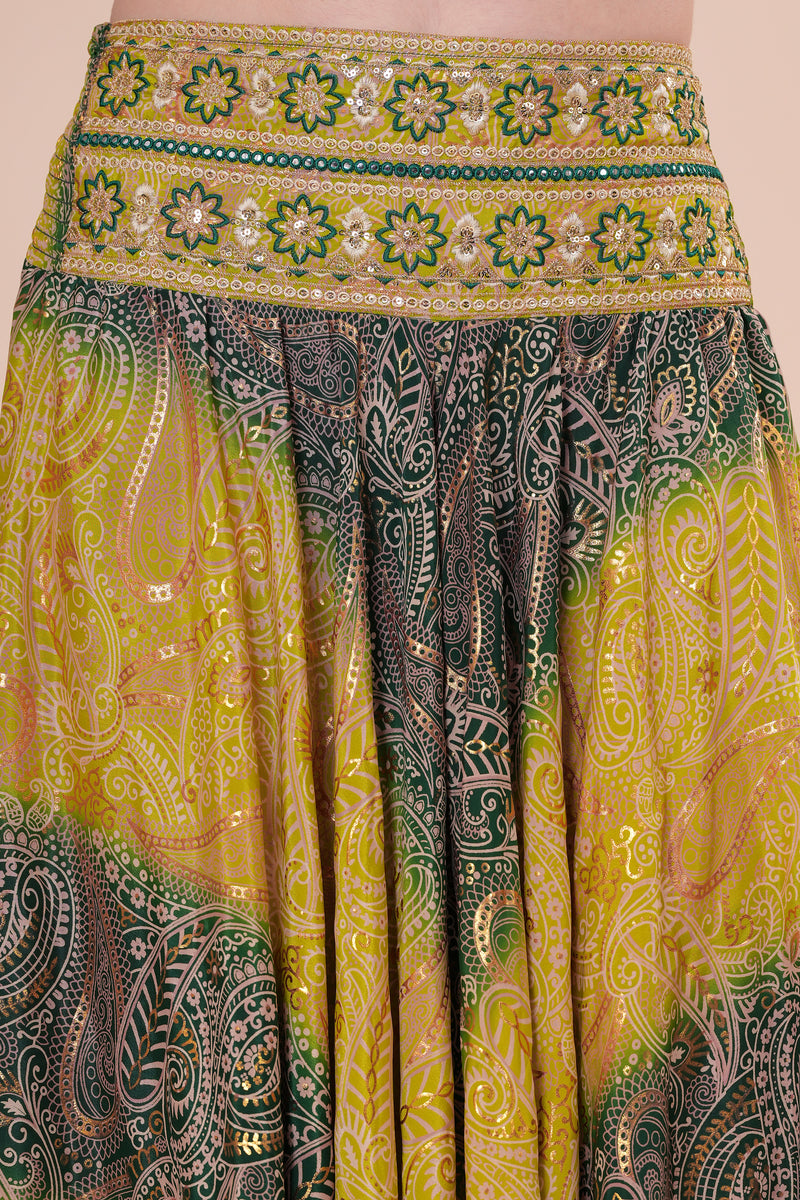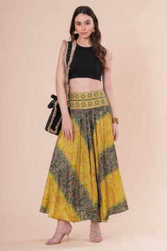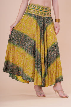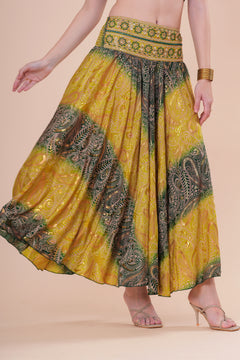 Añade un toque boho chic a tu look con esta fluida falda maxi. Confeccionada con un llamativo estampado étnico en mostaza y verde, su característica principal es la cintura ancha y bordada con detalles metálicos. Perfecta para un estilo cómodo y elegante de verano.
