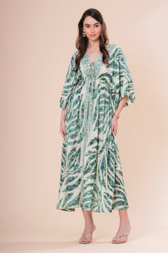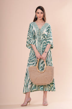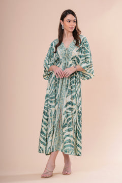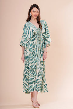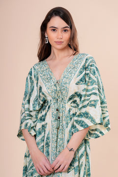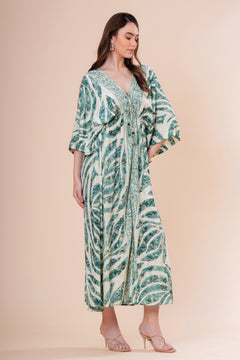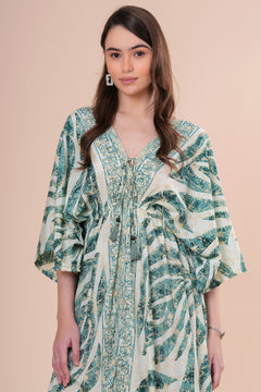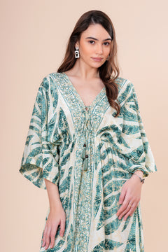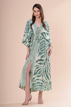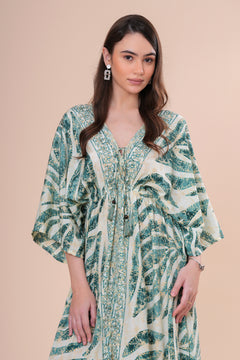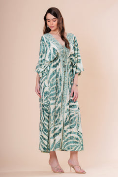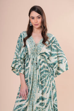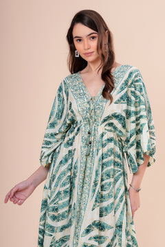 El kaftán perfecto para un estilo relajado y chic. Con un estampado botánico en tonos verdes, este vestido oversize ofrece una silueta cómoda y fluida. Ideal para la playa o un evento casual de verano. El escote V cuenta con un elegante detalle de cuentas y borlas.