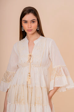Un encantador minivestido crudo que irradia un estilo bohemio-chic. Destaca por sus delicados bordados dorados que adornan el escote en V y las mangas 3/4 con volantes escalonados. La falda también cuenta con volantes en capas, creando un movimiento ligero y etéreo. Perfecto para un look de día elegante o una tarde de verano.