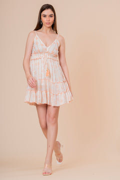 Brilla este verano con este encantador minivestido de tirantes. Confeccionado en una tela ligera blanca con delicadas rayas verticales doradas y bordados sutiles. Su diseño de corte imperio con borlas y falda escalonada con volantes le da un movimiento espectacular. Ideal para fiestas de día o salidas casuales.