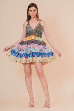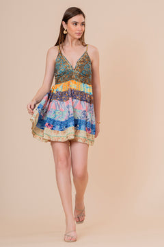 Un minivestido romántico y fresco, ideal para los días cálidos. Su corte de tirantes finos y escote V se complementa con un delicado estampado floral en tonos rosa y verde. La cintura elástica y el volante en el bajo crean una silueta cómoda y femenina, perfecta para la playa o un paseo.