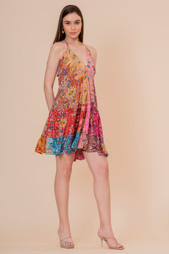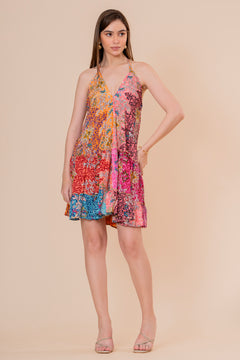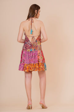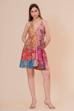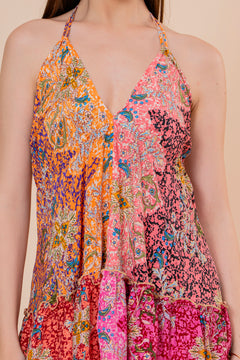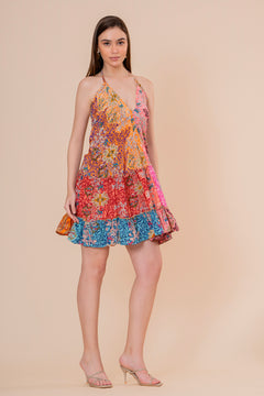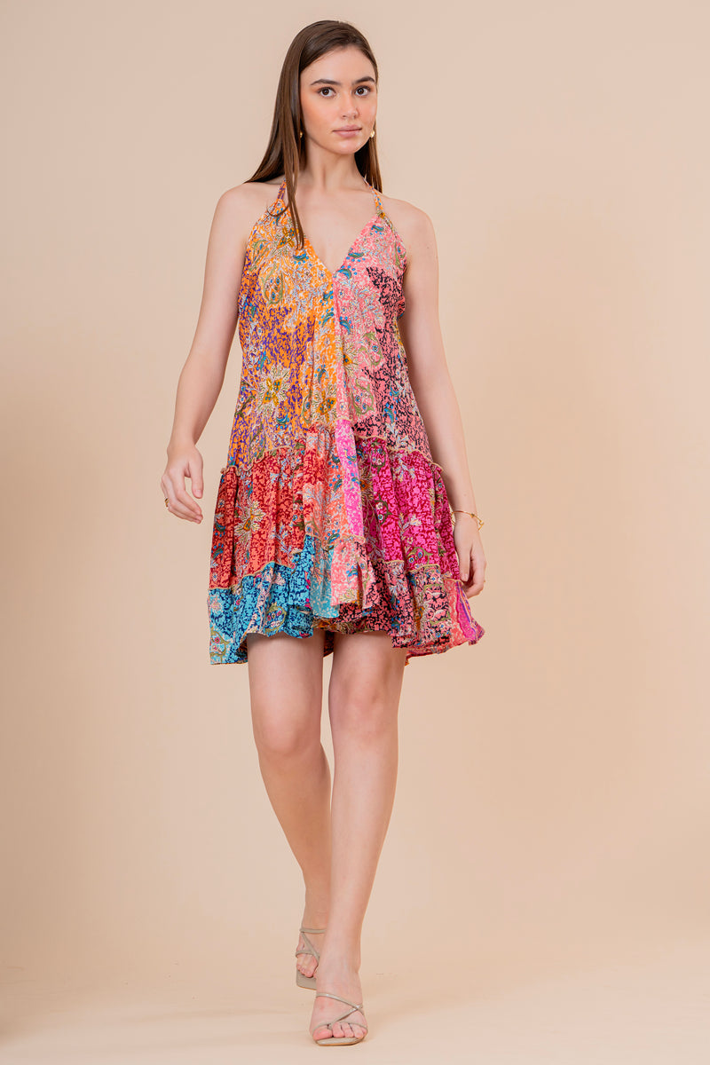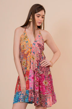 Llena tus días de color con este vibrante minivestido halter. Su diseño único de patchwork combina tonos rosas, naranjas y azules en un estampado bohemio. El corte suelto con volante en el bajo y la espalda descubierta lo hacen la opción más fresca y juvenil para la playa o vacaciones.