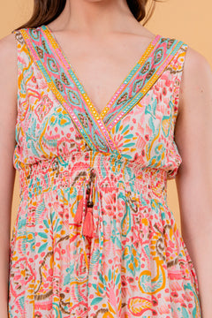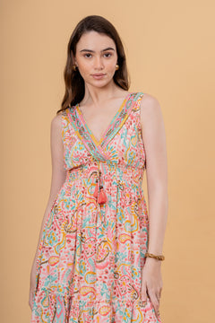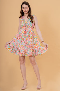 Un minivestido sin mangas perfecto para el calor. La cintura fruncida se ajusta cómodamente, mientras que la falda de volantes crea una silueta juguetona. Con un alegre estampado cachemira y escote decorado, es ideal para la playa o un paseo de verano.