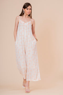 Un mono jumpsuit (enterito) que combina elegancia y comodidad. Su diseño de pierna ancha y tirantes finos presenta sutiles rayas verticales doradas que estilizan la figura y aportan un toque de brillo. Confeccionado en tela ligera y con bolsillos laterales, es ideal para eventos de verano o una cena en la playa.