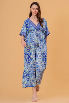 Un elegante y cómodo mono jumpsuit de pernera ancha, ideal para un look completo y sin esfuerzo. Destaca por su vibrante estampado de azulejos en tonos azules y su escote V con cenefa. La manga kimono y la cintura fruncida con borlas garantizan un ajuste perfecto y cómodo.