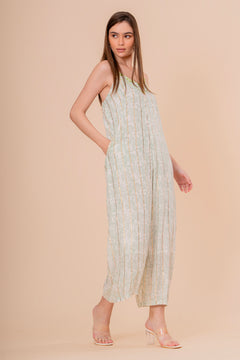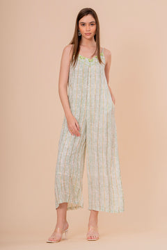 Un mono jumpsuit (enterito) elegante y fresco en tono blanco crudo. Su diseño de tirantes finos y pernera ancha se realza con un llamativo bordado verde neón en el escote V. Confeccionado en un tejido ligero con textura sutil y bolsillos laterales, es perfecto para un look de día o resort.