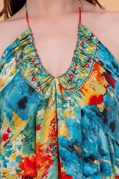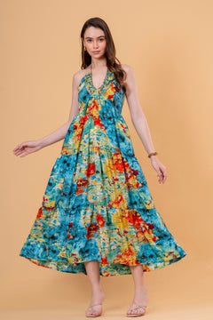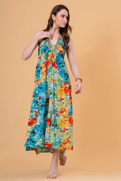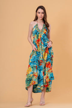 ¡El vestido perfecto para tus días de calor! Este Vestido Maxi de corte Halter tiene un vibrante estampado abstracto tipo acuarela en tonos turquesa y amarillo.