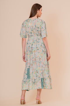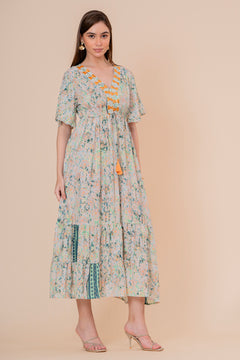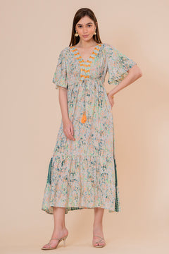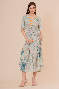 Un impresionante vestido maxi en suave tono crudo, perfecto para un estilo romántico y bohemio. Confeccionado en una tela de lunares en relieve (swiss dot), destaca por su escote bordado y sus elegantes mangas largas acampanadas. El diseño es fluido y etéreo, con volantes en la falda y mangas, todos adornados con pequeñas borlas decorativas.