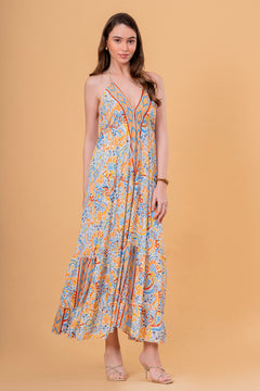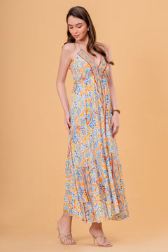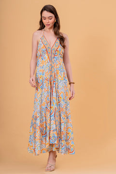 Vestido Maxi de Tirantes con Estampado Étnico y Volante