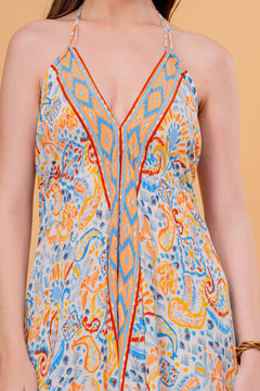 Un imprescindible para el verano. Este vestido maxi de tirantes presenta un vibrante estampado étnico y un favorecedor escote en V profundo con ribete de contraste. El ajuste debajo del busto (corte imperio) y el volante en el bajo añaden una caída fluida y cómoda.