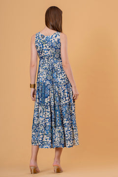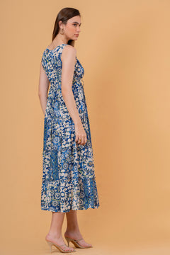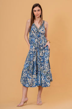 Vestido Midi de Tirantes Azulejo Azul con Escote Bordado