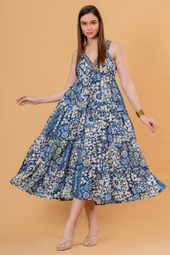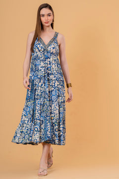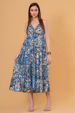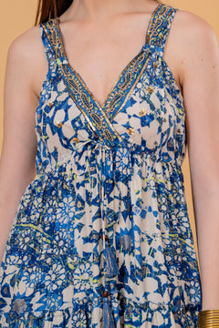 Un vestido midi de tirantes ideal para tus días de playa y paseo. Su silueta fluida presenta un cautivador estampado de azulejos en tonos de azul rey y turquesa. El escote V está elegantemente adornado con un bordado y borlas.