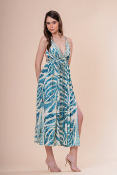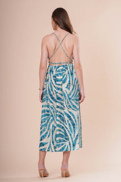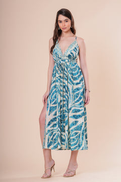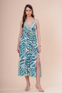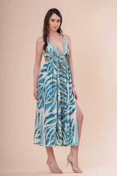 El vestido midi perfecto para tus días de sol. Cuenta con un llamativo escote en V profundo y tirantes finos, destacando la cintura con un lazo ajustable y borlas decorativas. Su fluido estampado botánico en turquesa y crudo es ideal para la playa y el resort.