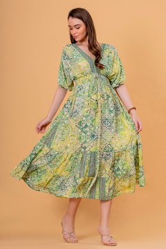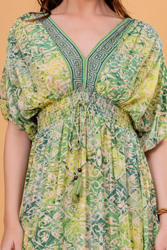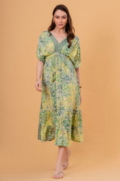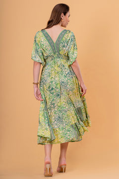 Vestido Midi Fruncido Manga Kimono Estampado Verde
