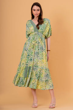 Un vestido midi con un vibrante estampado geométrico en tonos de verde y lima. Cuenta con un cuerpo cómodo de cintura fruncida y un elegante escote en V con ribete. Las mangas kimono y la falda escalonada añaden un look fluido y chic, ideal para cualquier ocasión de verano.