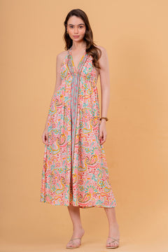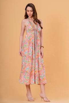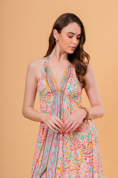 Vestido Midi Halter Estampado Pastel con Bordado