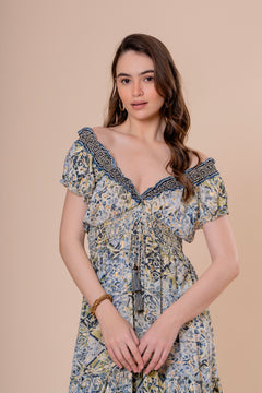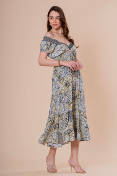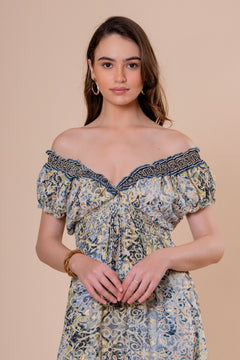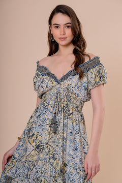 Un vestido midi con un toque romántico gracias a su escote off-the-shoulder y mangas abullonadas cortas. El estampado de azulejos en tonos azules y neutros es sofisticado. Cuenta con cuerpo fruncido y falda con volantes escalonados para una silueta con movimiento.