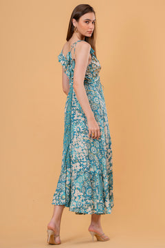 Vestido Midi Manga 3/4 Estampado Étnico Naranja y Azul