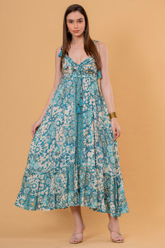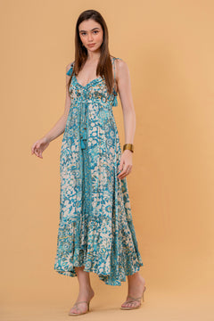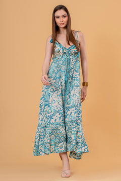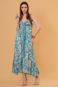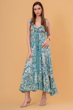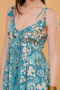 Un vestido midi fluido con un alegre estampado étnico en tonos de naranja vibrante y azul rey. La cómoda manga 3/4 y el elegante escote en V adornado con un ribete y borlas crean un look perfecto para cualquier ocasión de día o viaje.