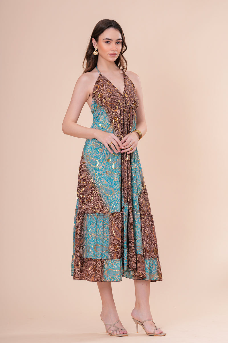 Vístete con el espíritu bohemio de este vestido midi con un escote halter y estampado paisley en tonos tierra y turquesa. Ideal como vestido playero o para un festival. Su tejido ligero y su detalle dorado te harán brillar.