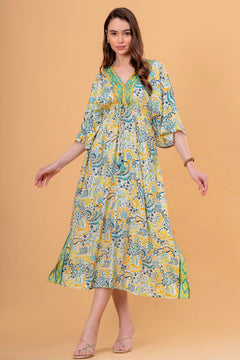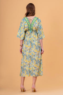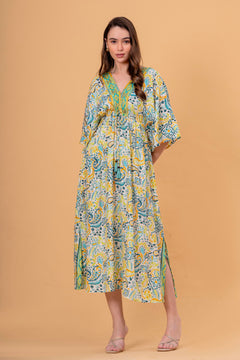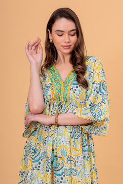 Este vibrante vestido túnica midi es perfecto para cualquier evento de verano o vacaciones. Destaca por su colorido estampado cachemira y el elegante bordado del escote V. La cintura fruncida ajustable permite un ajuste perfecto y cómodo.